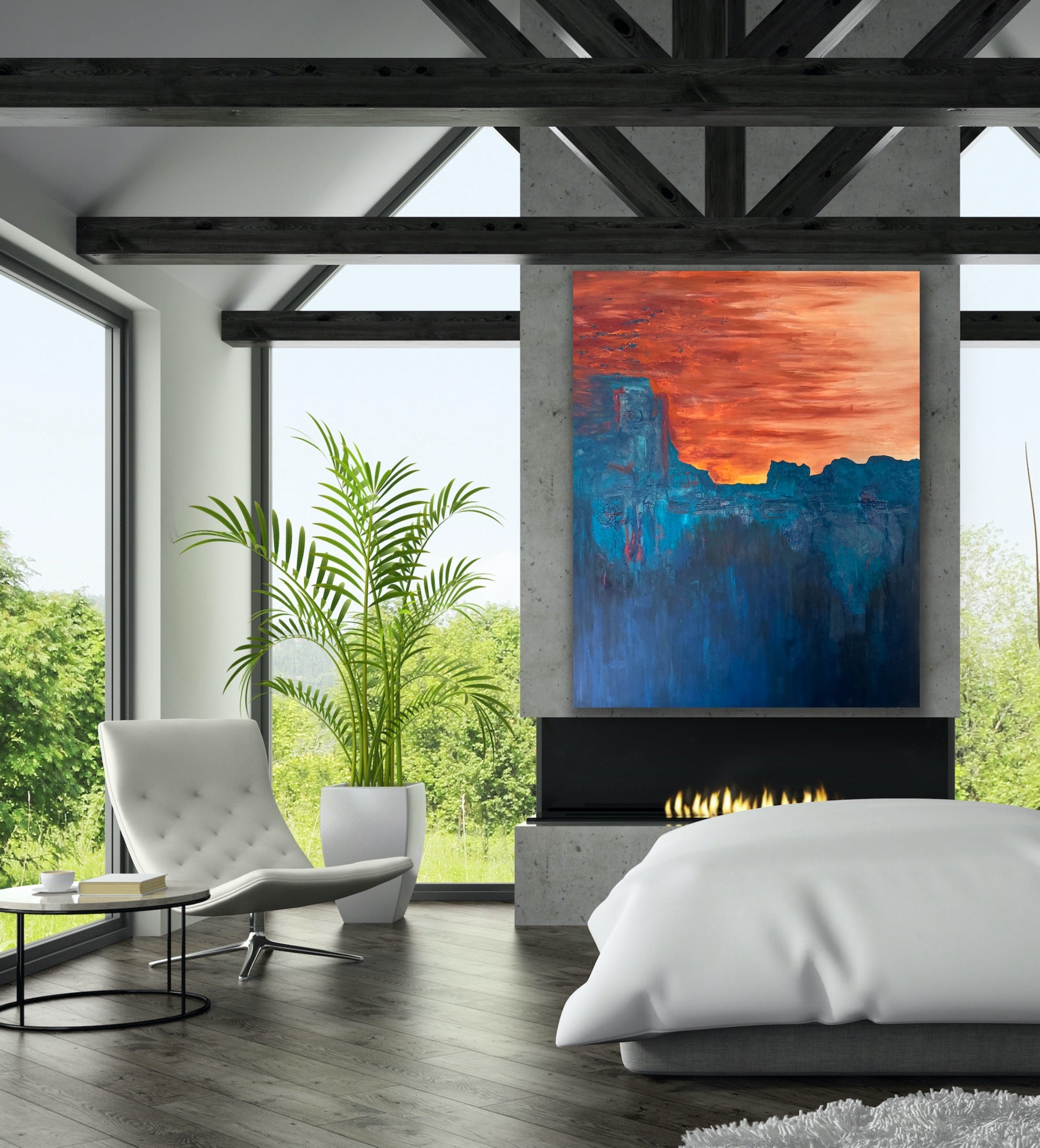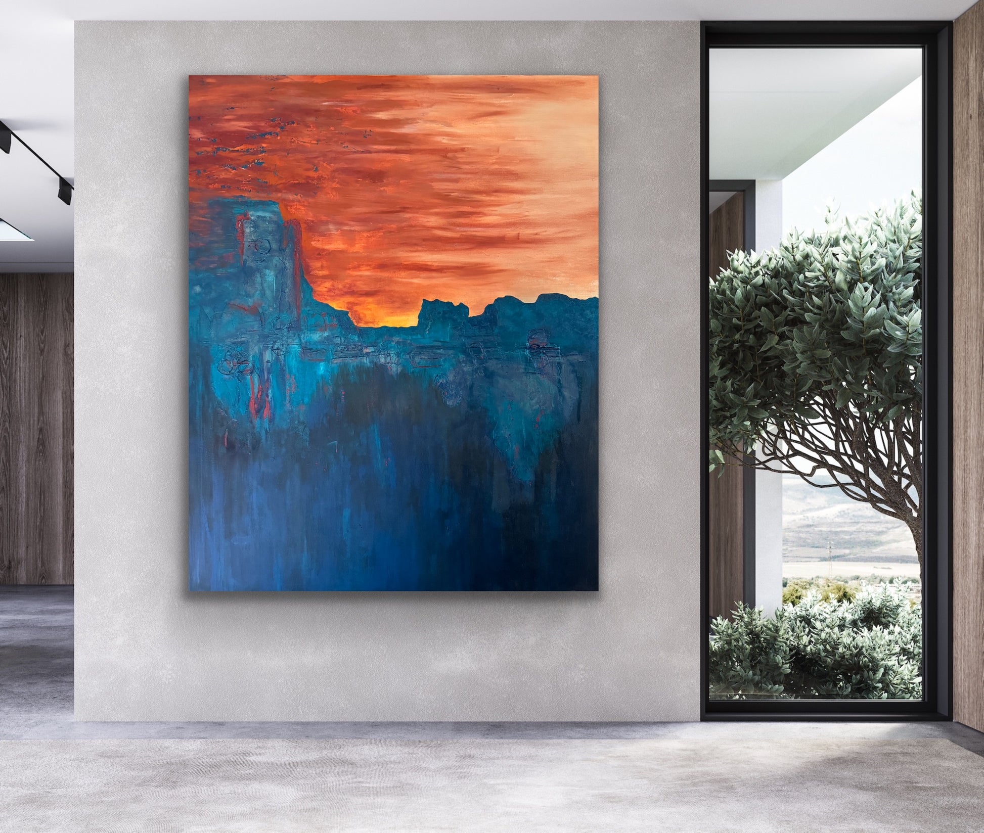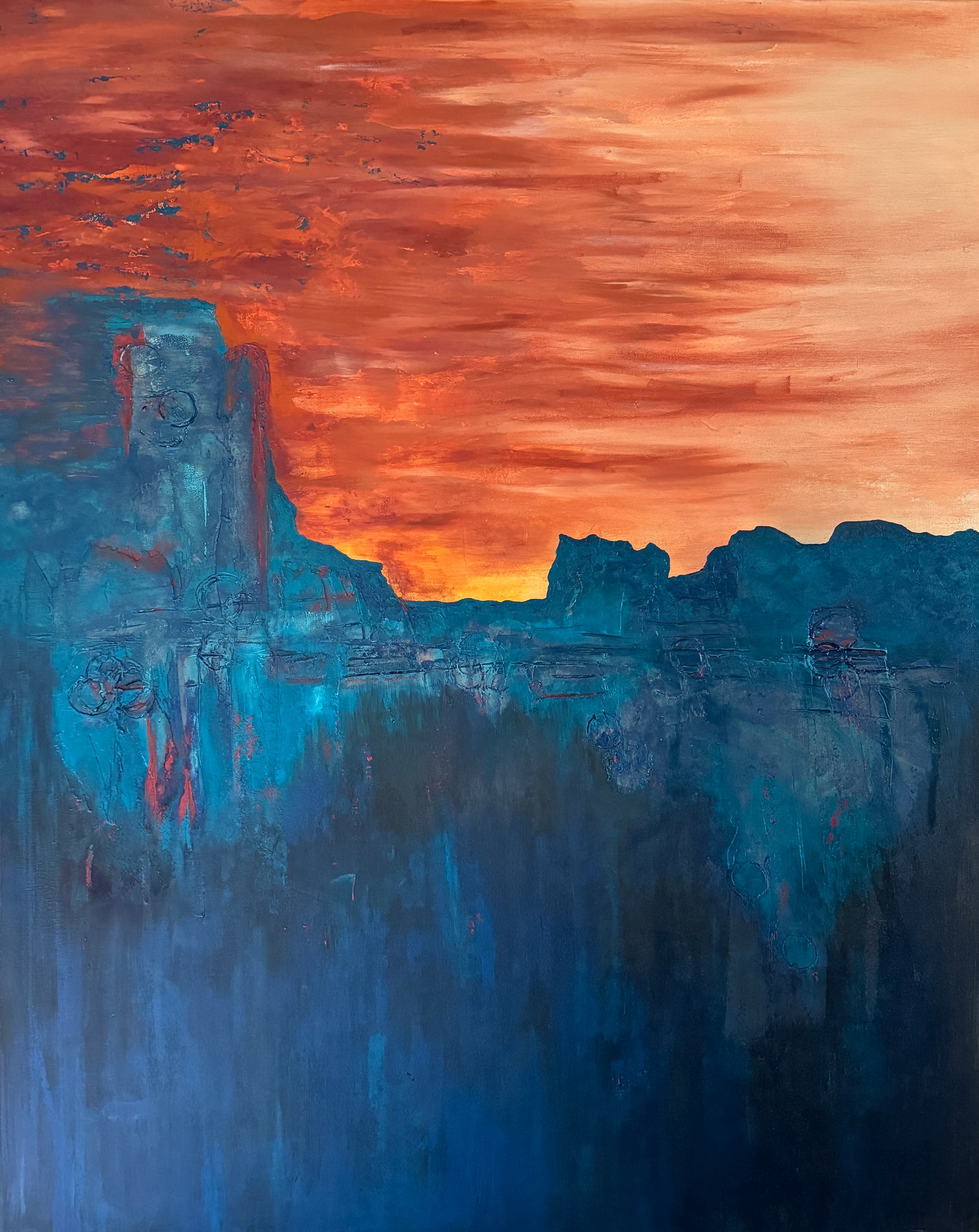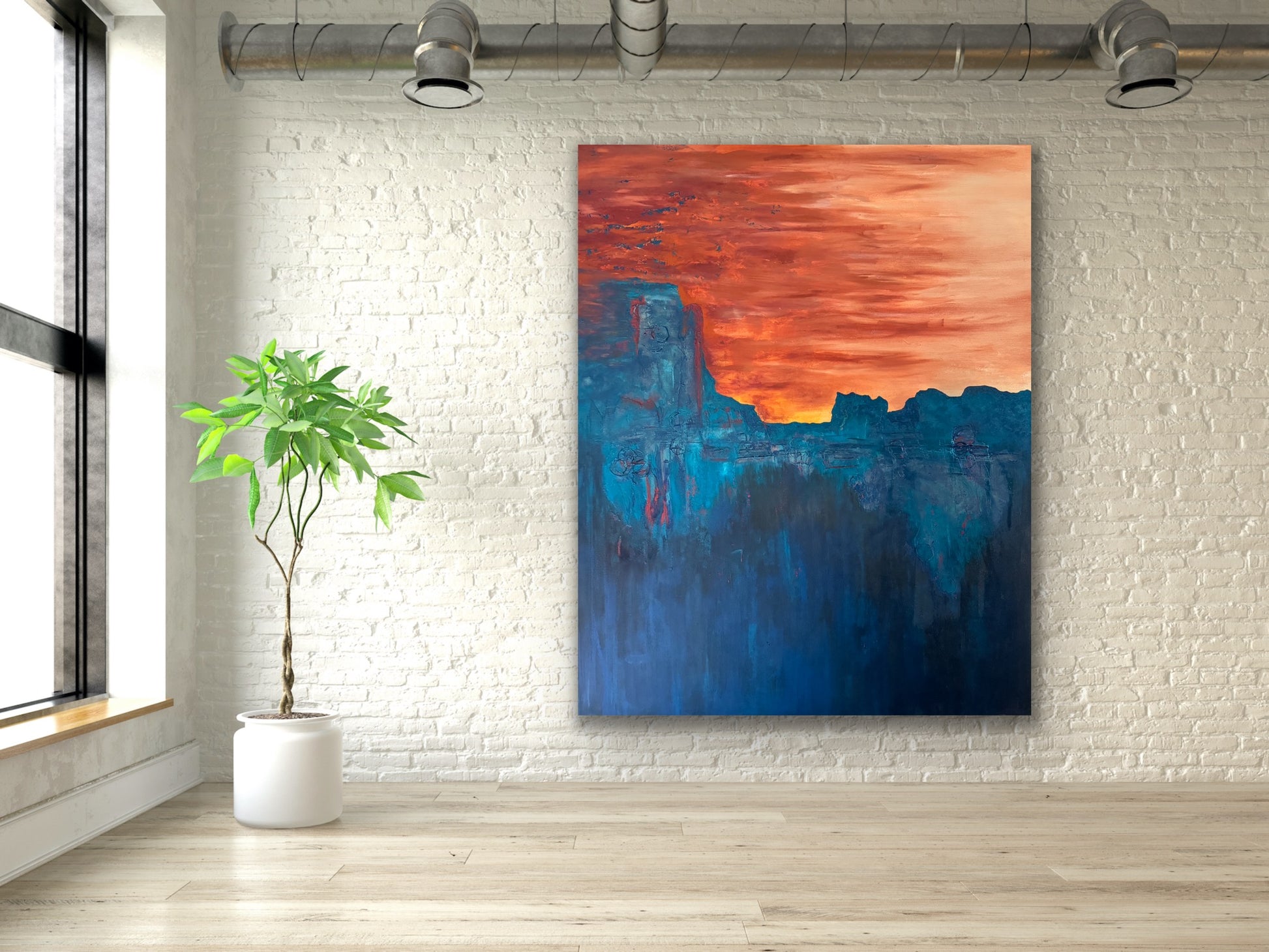 Ember Rising captures the powerful stillness of a world caught between fire and ocean—where the land holds memory and the sky burns with emotion. This large-scale abstract landscape uses a bold interplay of textures and color, transitioning from deep, moody blues and teals into a vibrant horizon ignited with molten orange, soft coral, and glowing peach.