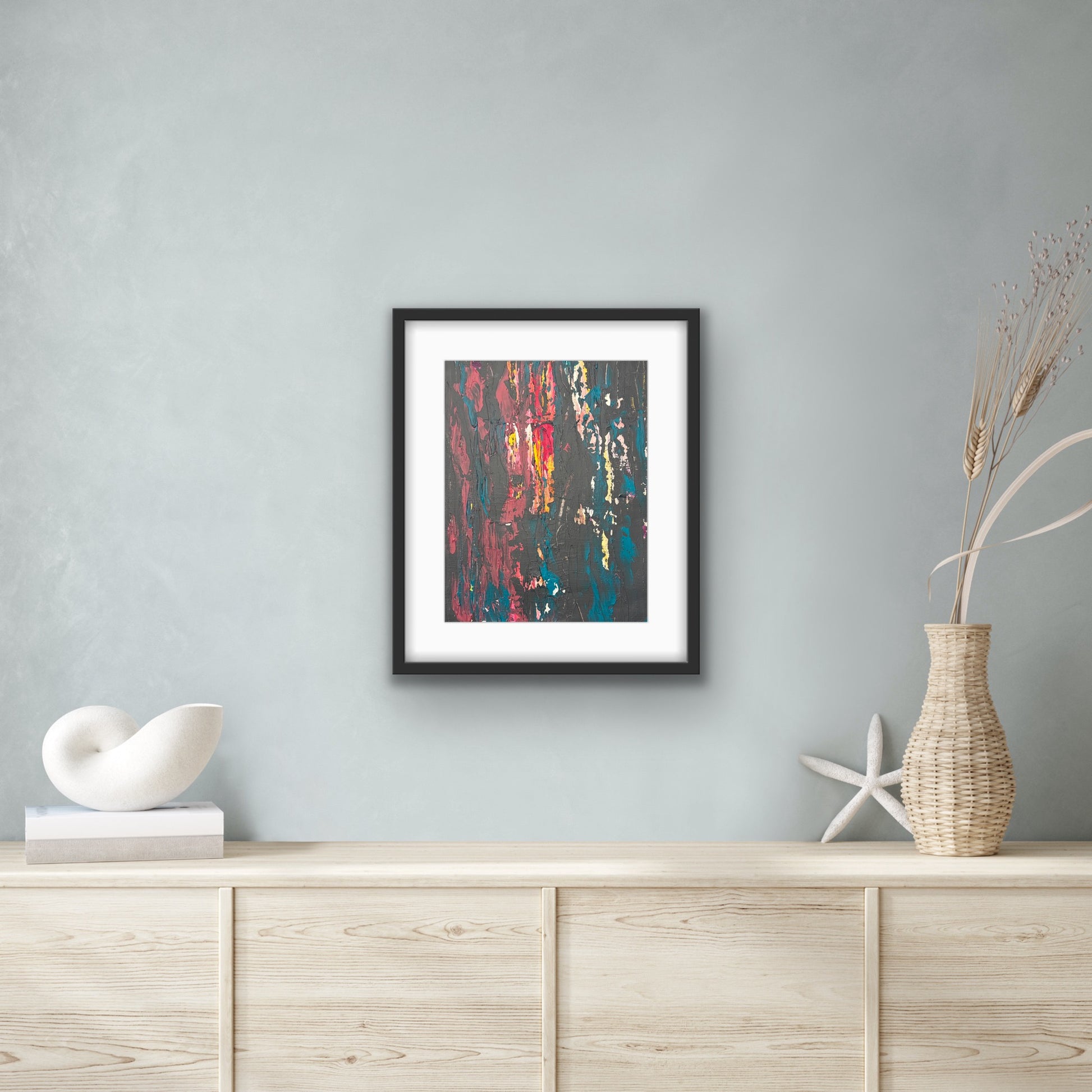 Flicker is a richly textured composition that plays with contrast—emotionally and visually. Bold streaks of magenta, teal, yellow, and coral push through a foundation of deep charcoal gray, as if light is breaking through stillness. Built with sculptural texture and gestural palette knife work, this piece invites viewers to pause and notice what pulses beneath the surface.