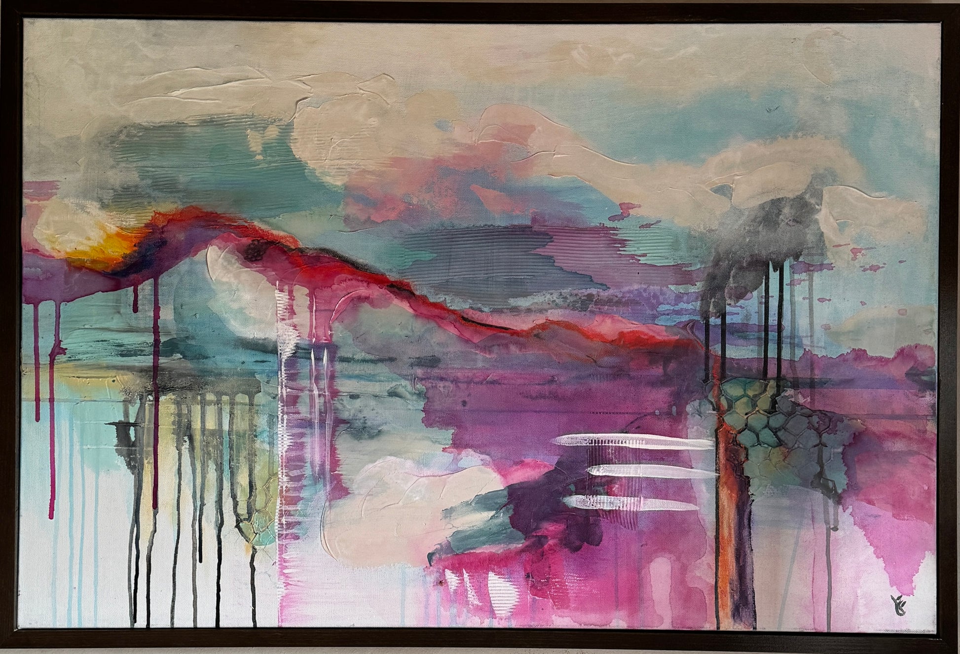 A dreamscape suspended between serenity and storm, Whispers Through the Veil is a lush abstract painting that channels emotion through layers of soft pastels, moody violets, and bursts of fiery coral. A mountain-like ridge of crimson energy cuts across the canvas, creating contrast and movement against the pale sky and cloudlike forms that drift throughout.